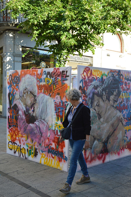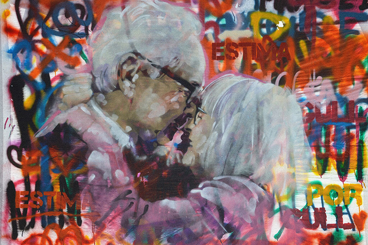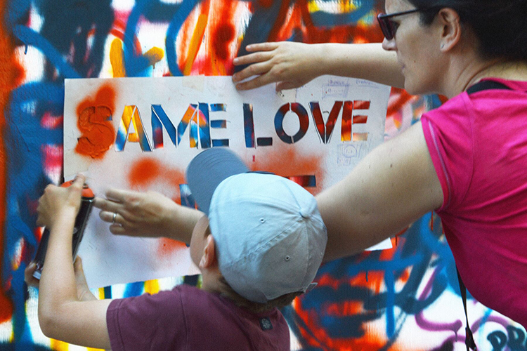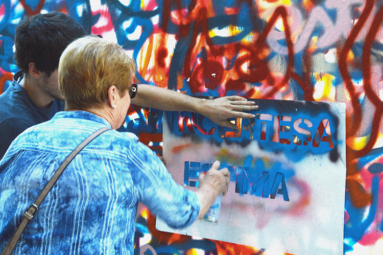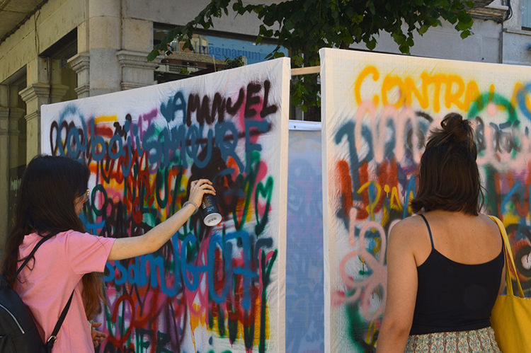 I wanted to create a positive space for the audience, created live and in collaboration with them. I invited anyone walking by to take a spray can and to paint on the cube, to express their souls with no restrictions on gender, nationality or age. An open wall to be whoever you want to be. Once the canvas was covered, I created a series of portraits painted live on each side of the cube, choosing a variety of relationships and personalities to convey with the words and thoughts bringing them alive.